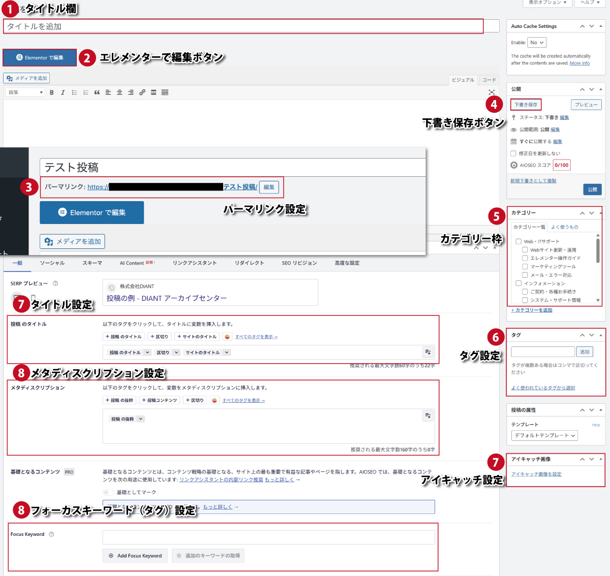4.AIOSEO設定: 画面を下へスクロールし、「AIOSEO設定」の項目を見つけます。ここで、Google検索などの結果に表示される「投稿のタイトル」と「メタディスクリプション(記事の簡単な説明文)」を入力します。
