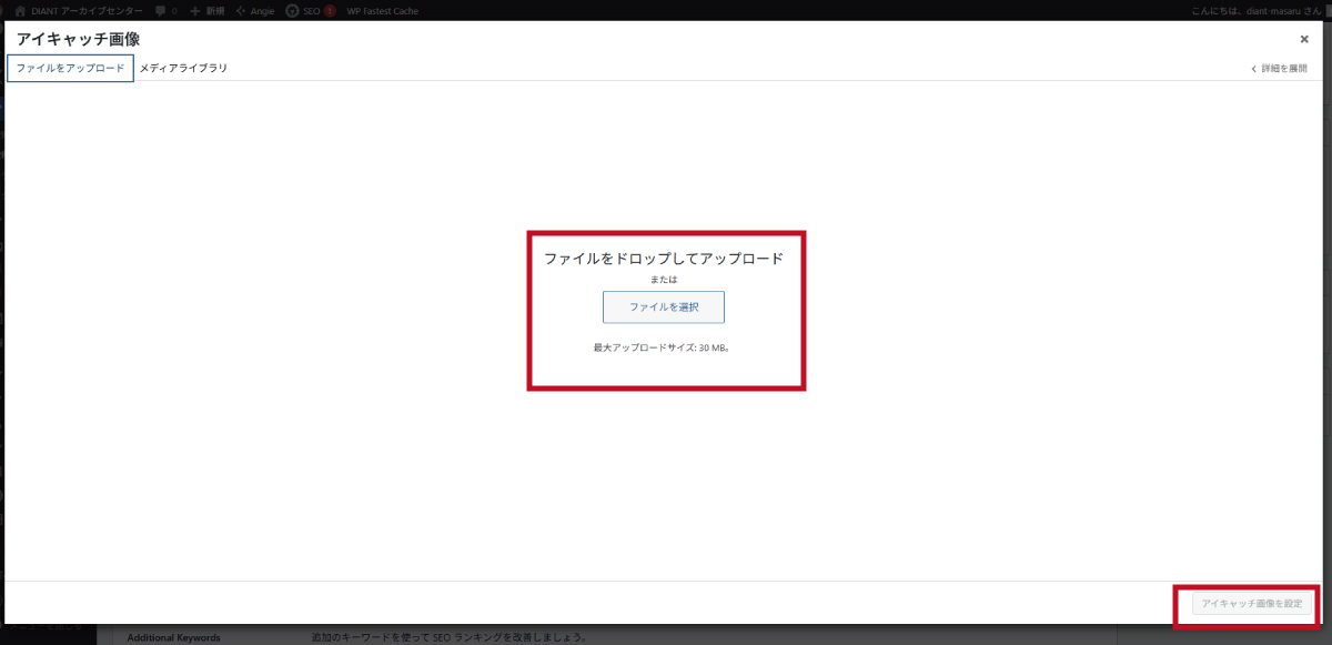 3.アップロードした画像を選択し、右下の青い「アイキャッチ画像を設定」ボタンをクリックします。