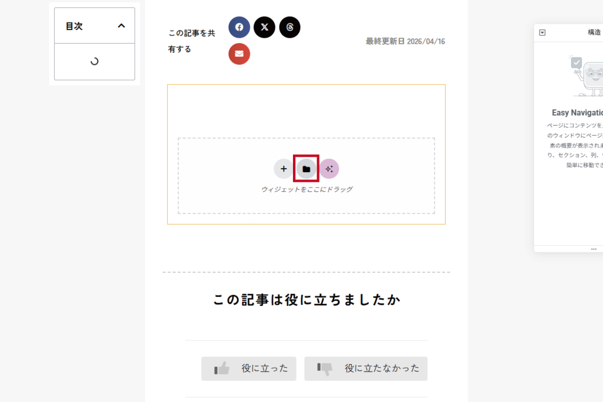 Elementorの編集画面に切り替わったら、あらかじめ用意されたブログ用のテンプレートを呼び出します。