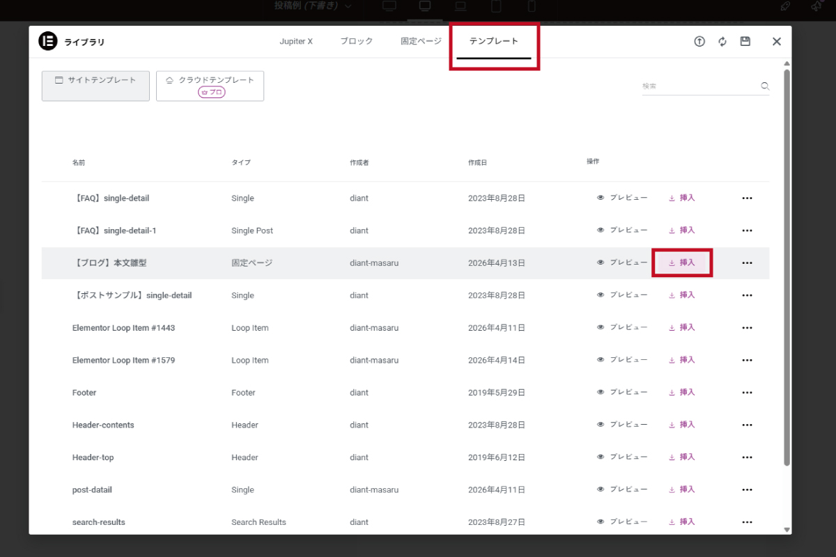 3.リストの中から「【ブログ】更新用テンプレート」を探し、右側の「挿入」をクリックします。