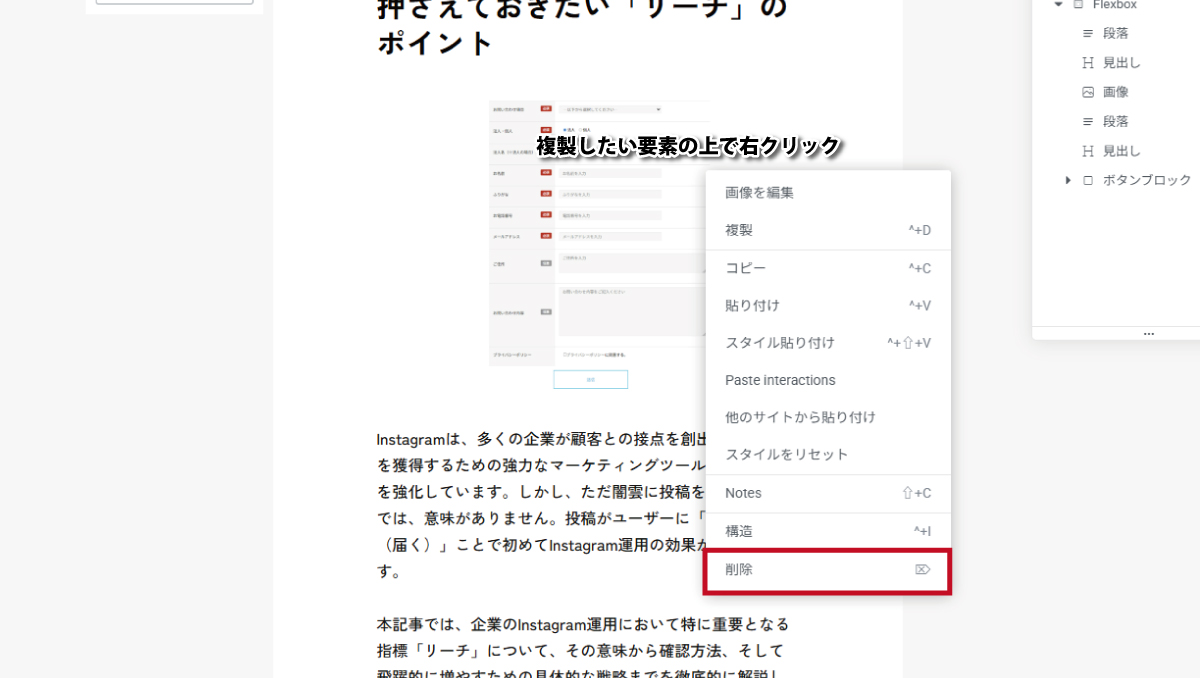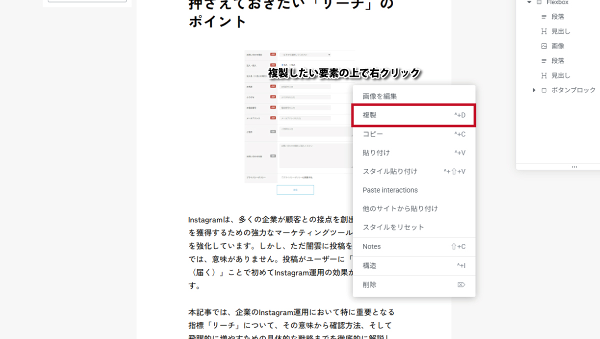 増やしたい(複製)場合: 増やしたい要素の上で右クリックし、出てきたメニューから「複製」を選びます。直下に同じものがコピーされますので、文章などを打ち変えて使用してください。