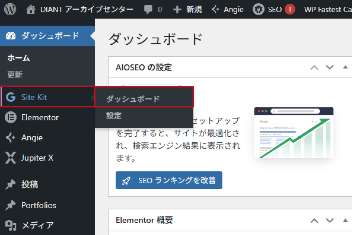 2.左側の黒いメニューの上の方にある「Site Kit」にマウスの矢印を合わせ、横に出てきた「ダッシュボード」をクリックします。