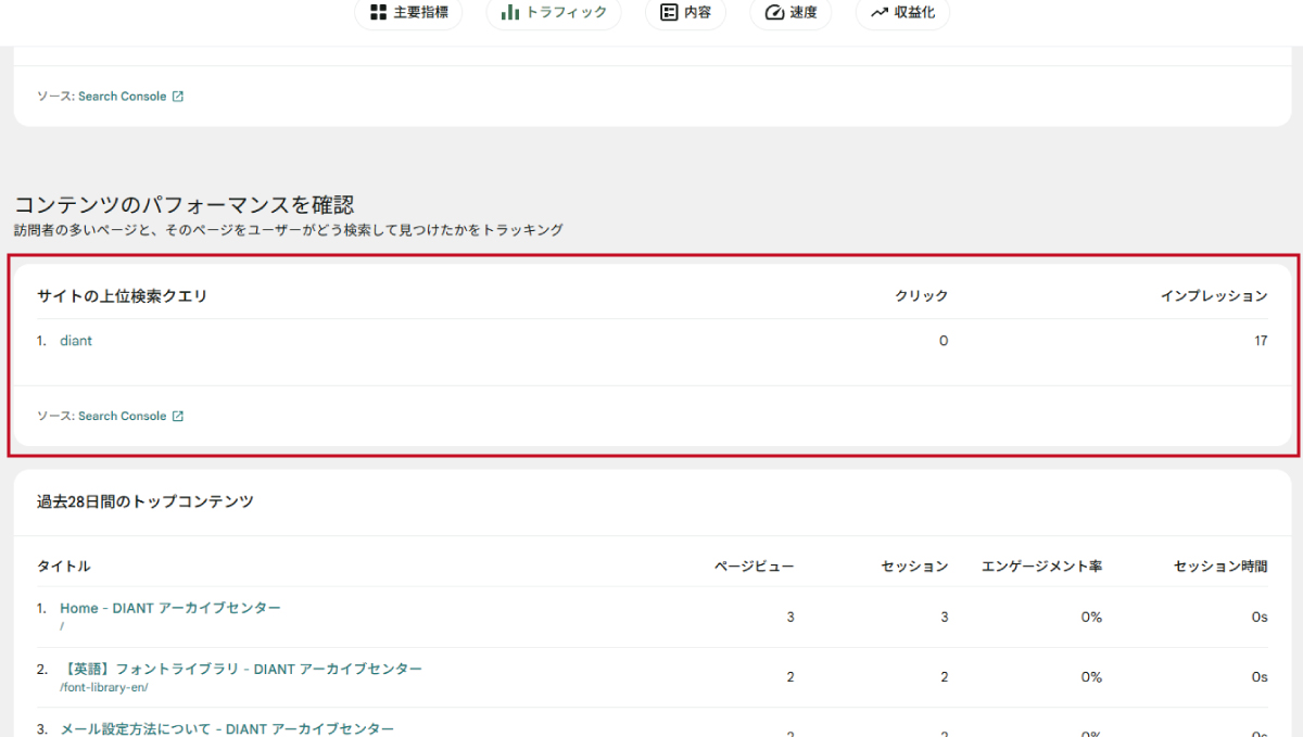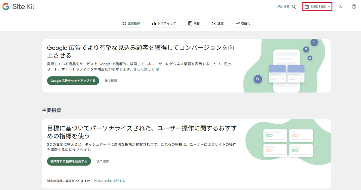 画面が開いたら、右上の日付が「過去 28 日間」になっているか確認しましょう。